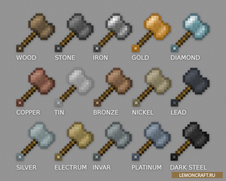 Мод Hammerz добавит в игру новый вид инструмента - молот. С этим инструментом время на разрушение блока значительно сократится. Кроме этого вы сможете производить улучшение вашего молота, что приведет еще к более быстрому разрушению блоков. Данный мод стыкуется с модом Tinkers' Construct.